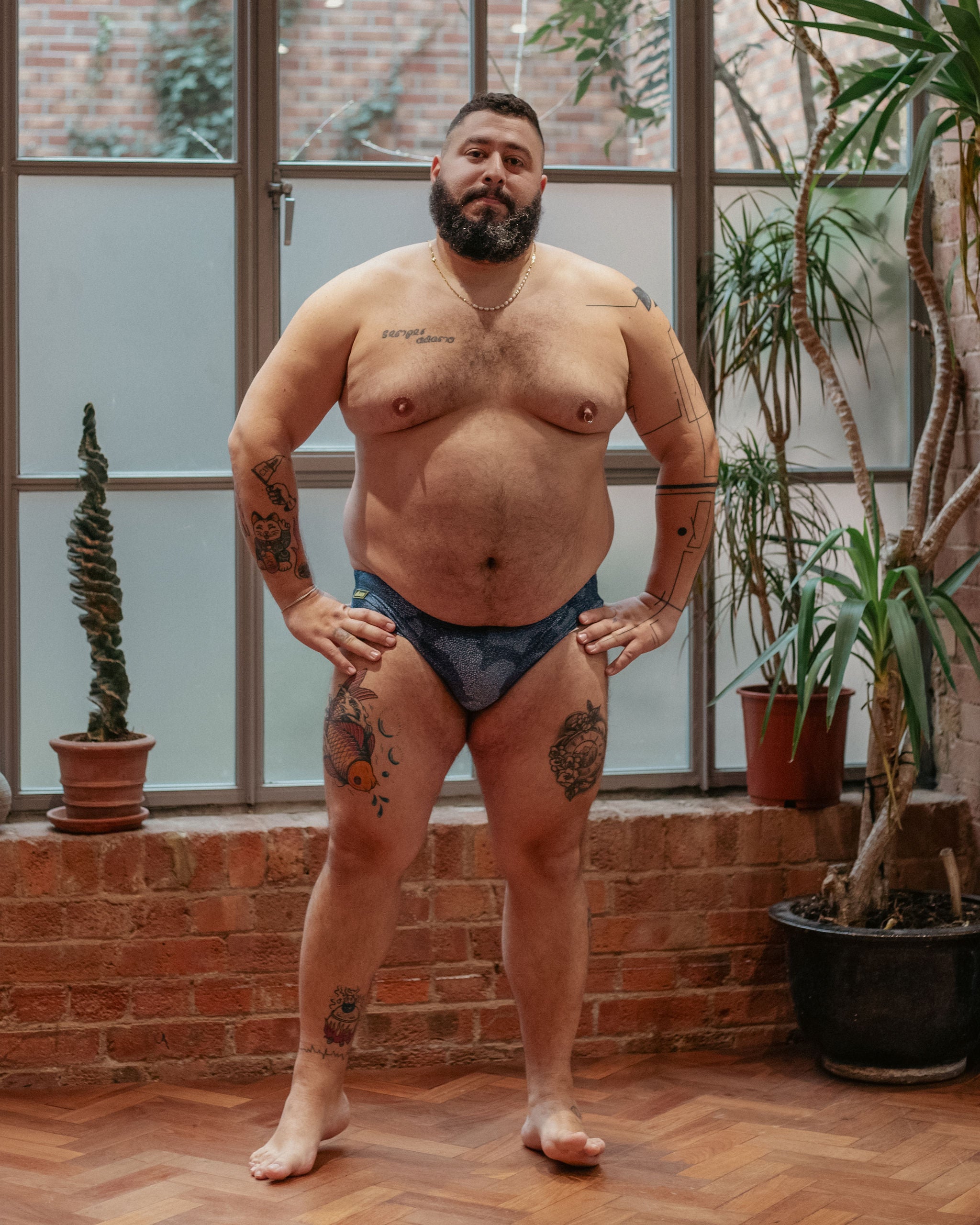Harry ( @harryjsmith_ ) wears size Medium , Jam ( @jamthebigbear ) wears size XXL, Theodoros ( @Theodorosv wears size 3XL)