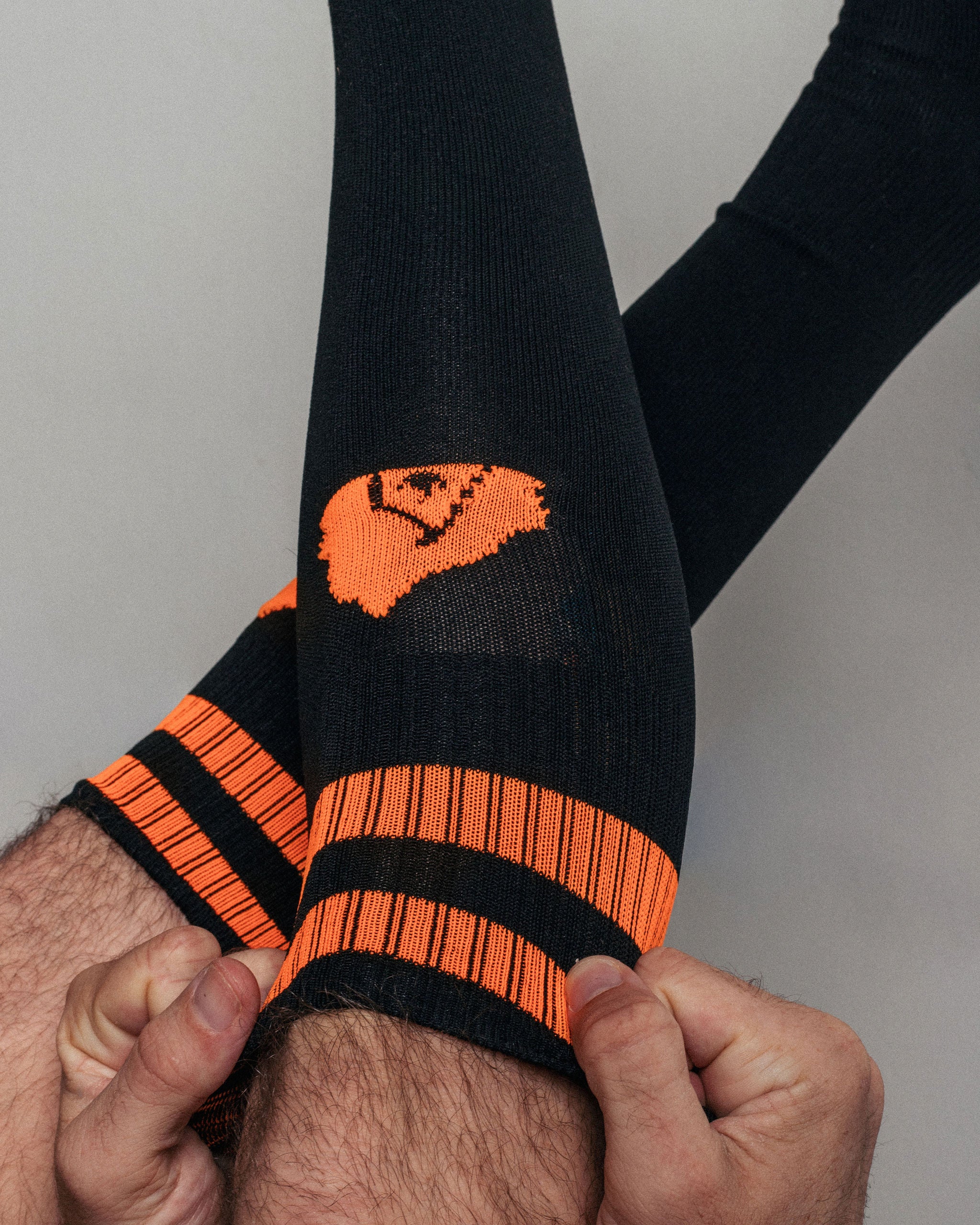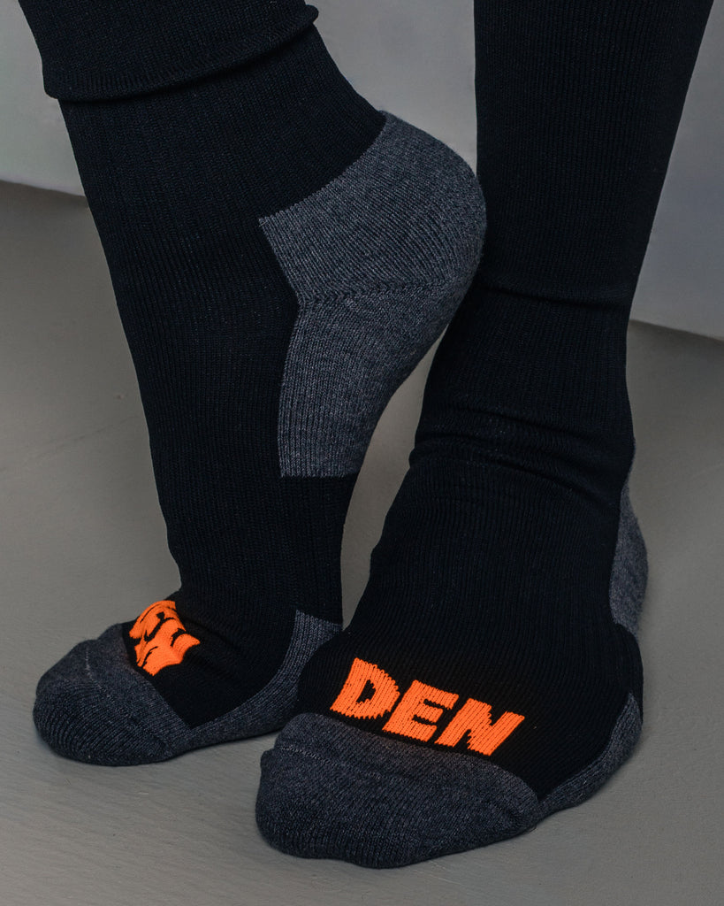 With DEN logo on the shin and DEN word logo across the toes. One Size.