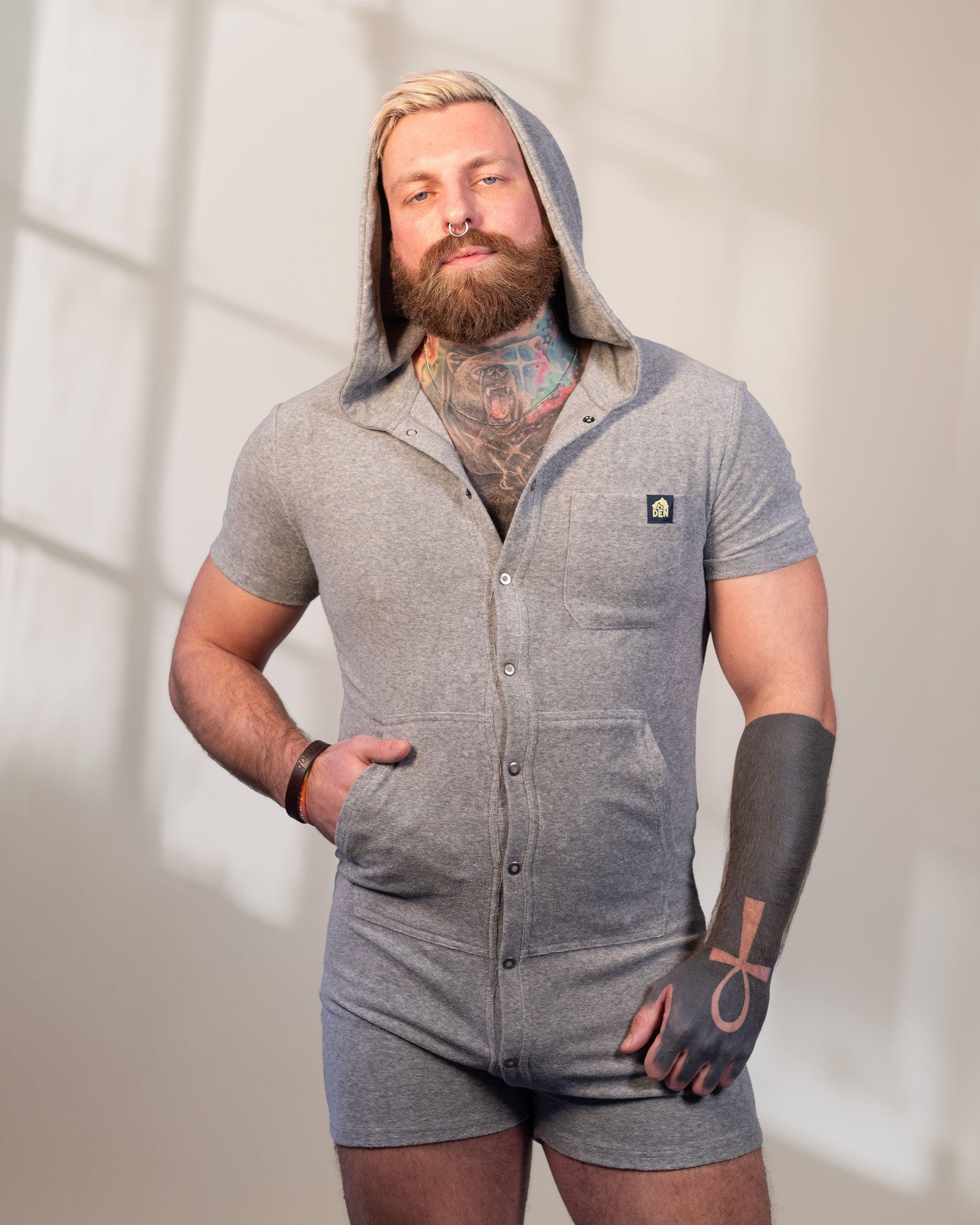 Short Sleeve Hooded Towelling Union Suit - Grey Marl
