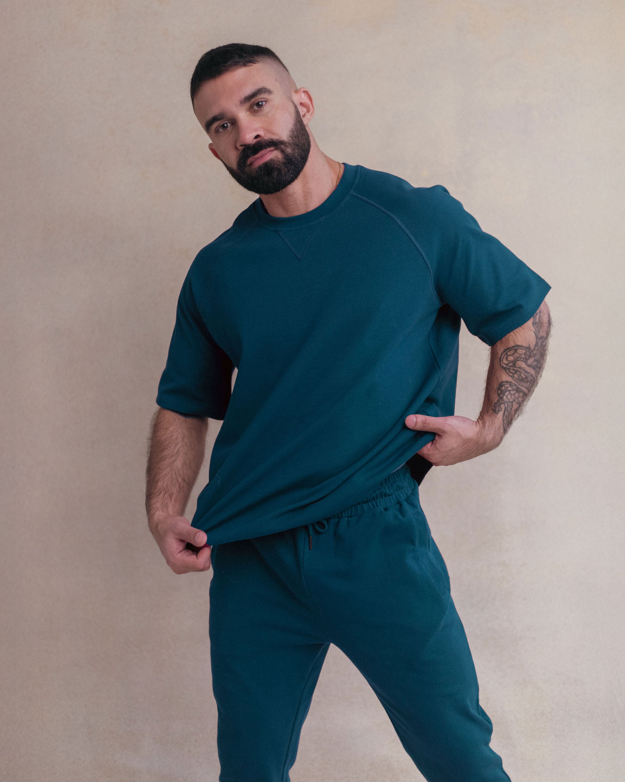 Premium loungewear separates, crafted from our signature stretch-rib cotton union suit fabric and finished with our distinctive ring-popper fastenings for a refined touch.