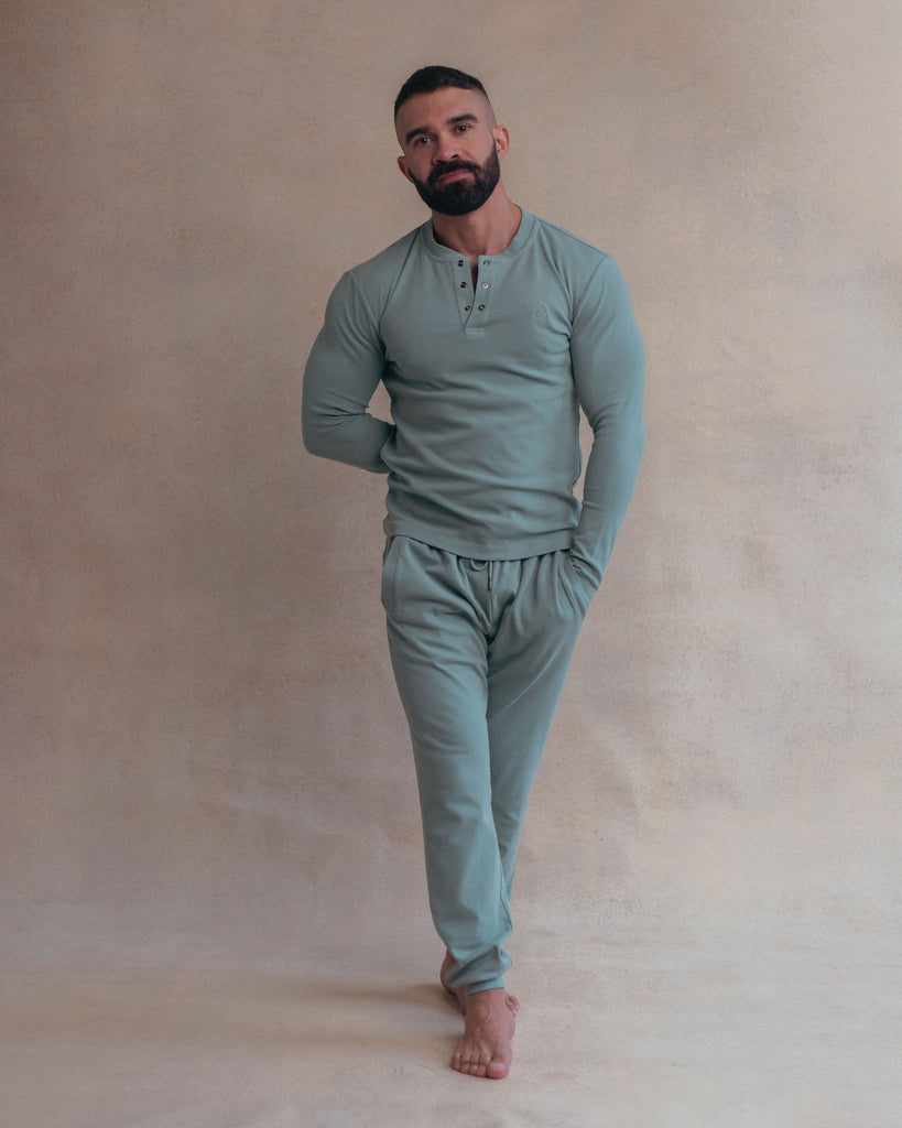 Premium loungewear separates, crafted from our signature stretch-rib cotton union suit fabric and finished with our distinctive ring-popper fastenings for a refined touch.