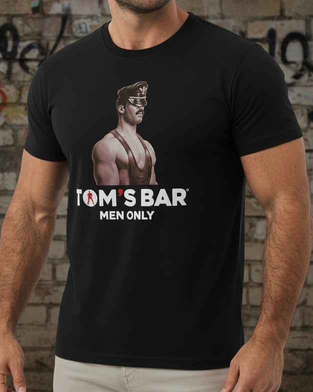 Design features the iconic TOM'S BAR logo on the front and DEN logo on the outside back neck