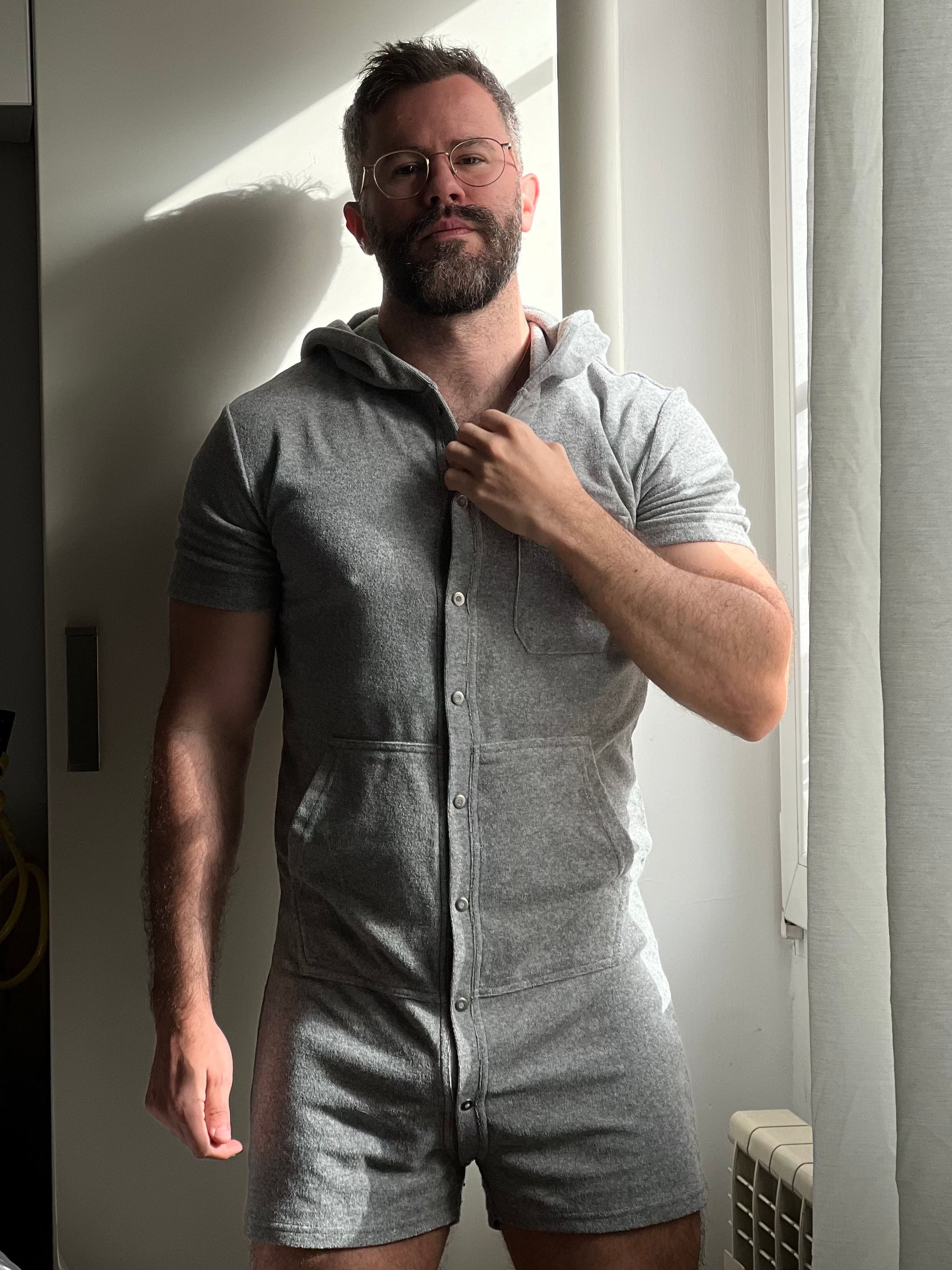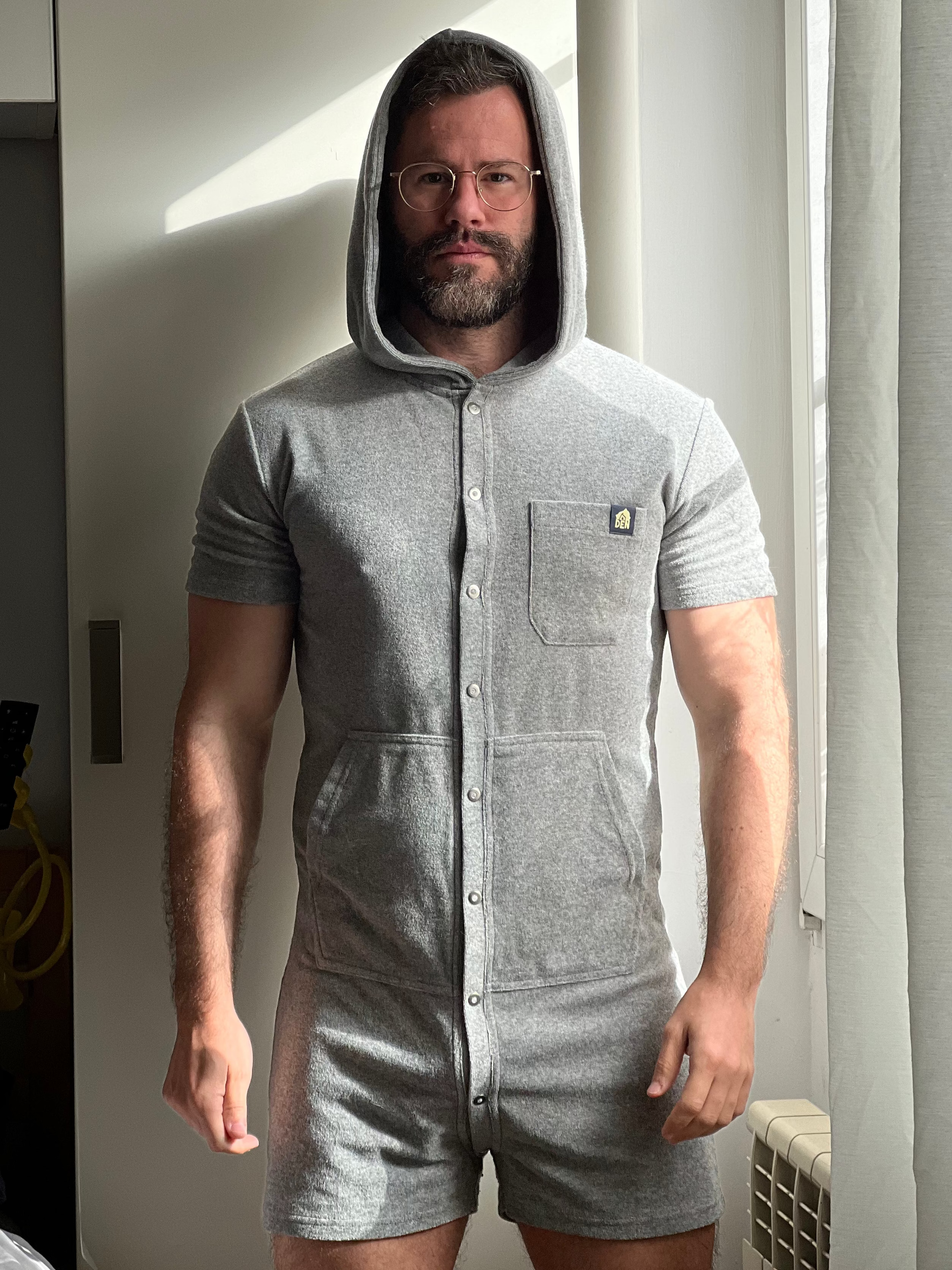 Short Sleeve Hooded Towelling Union Suit - Grey Marl