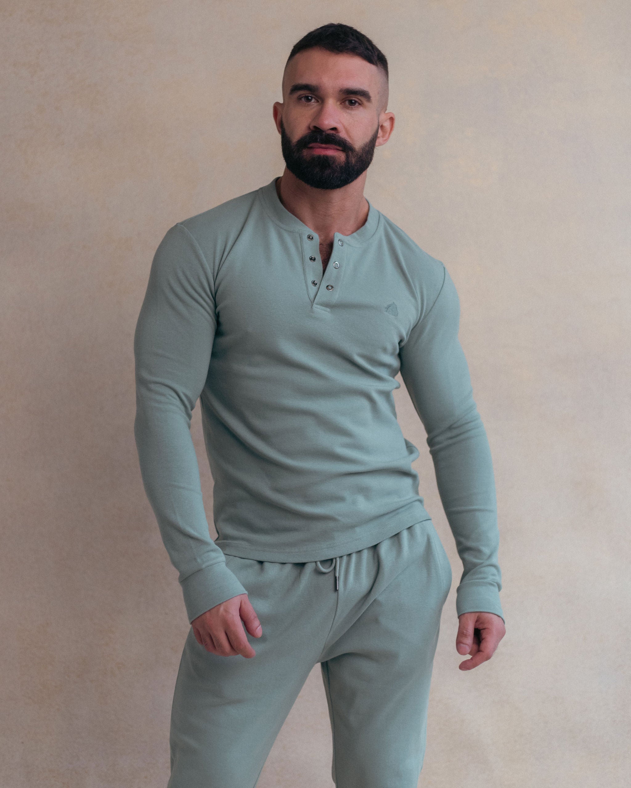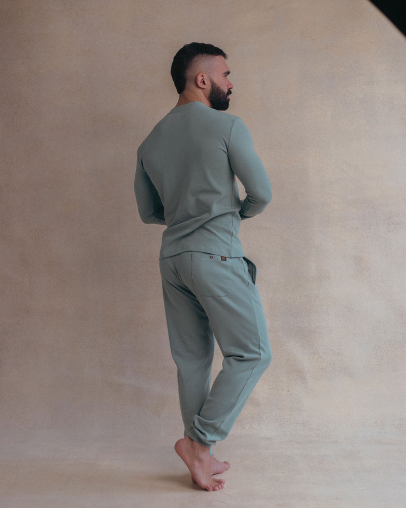 Premium loungewear separates, crafted from our signature stretch-rib cotton union suit fabric and finished with our distinctive ring-popper fastenings for a refined touch.